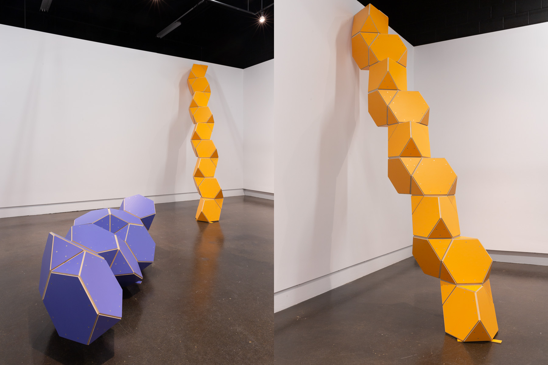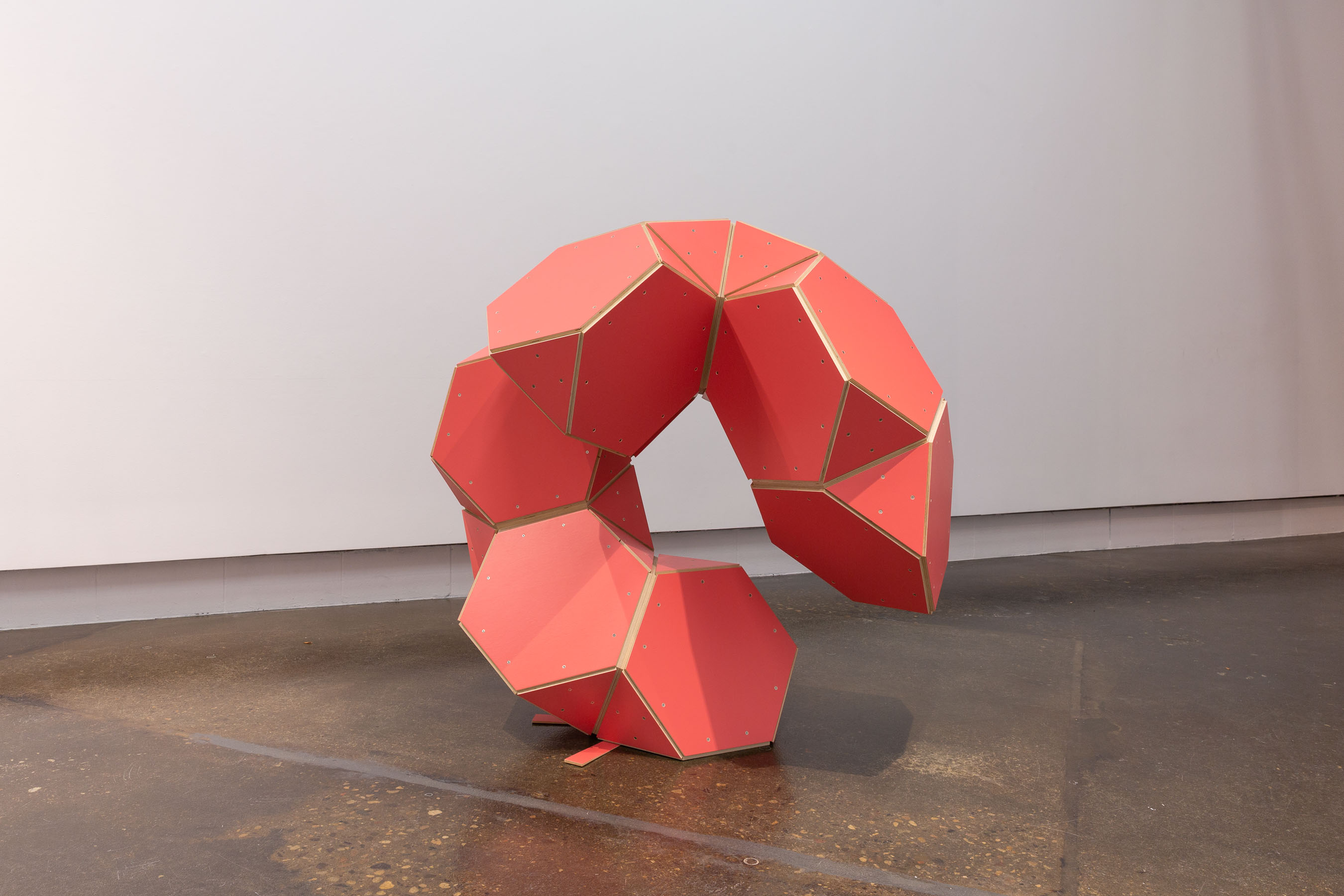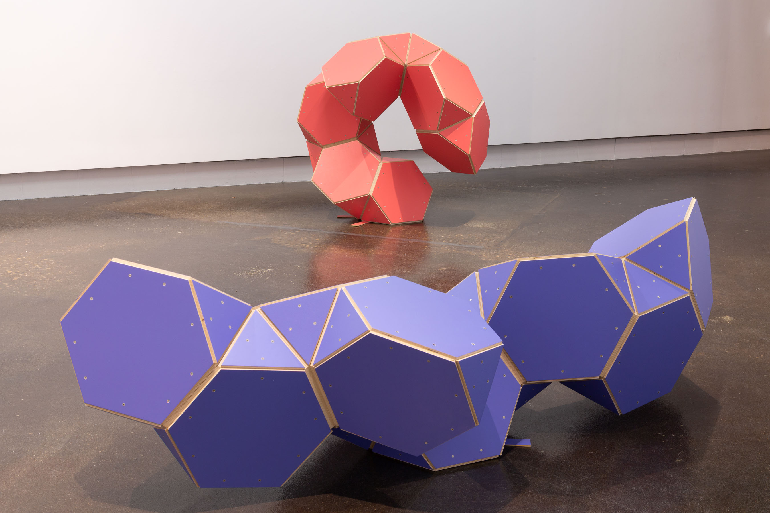 Laura Marotta generates grid systems that disrupt standard square and rectangular structures. Using modular building blocks, she constructs and assembles forms that zigzag back and forth, shaping volumes that are tilting and asymmetrical. New Balance is a series of painted plywood tetrahedron sculptures that twist and turn and loop through space. These objects invite viewers to interact, to walk around and through compositions where negative space is as vital as the positive material form. While they reference public shelters, outdoor seating, or domestic objects like table tops, they also operate as architectural models; speculative plans and imaginative prompts that invite us to consider the potential of interacting—with each other and each form—on macro and miniature scales.