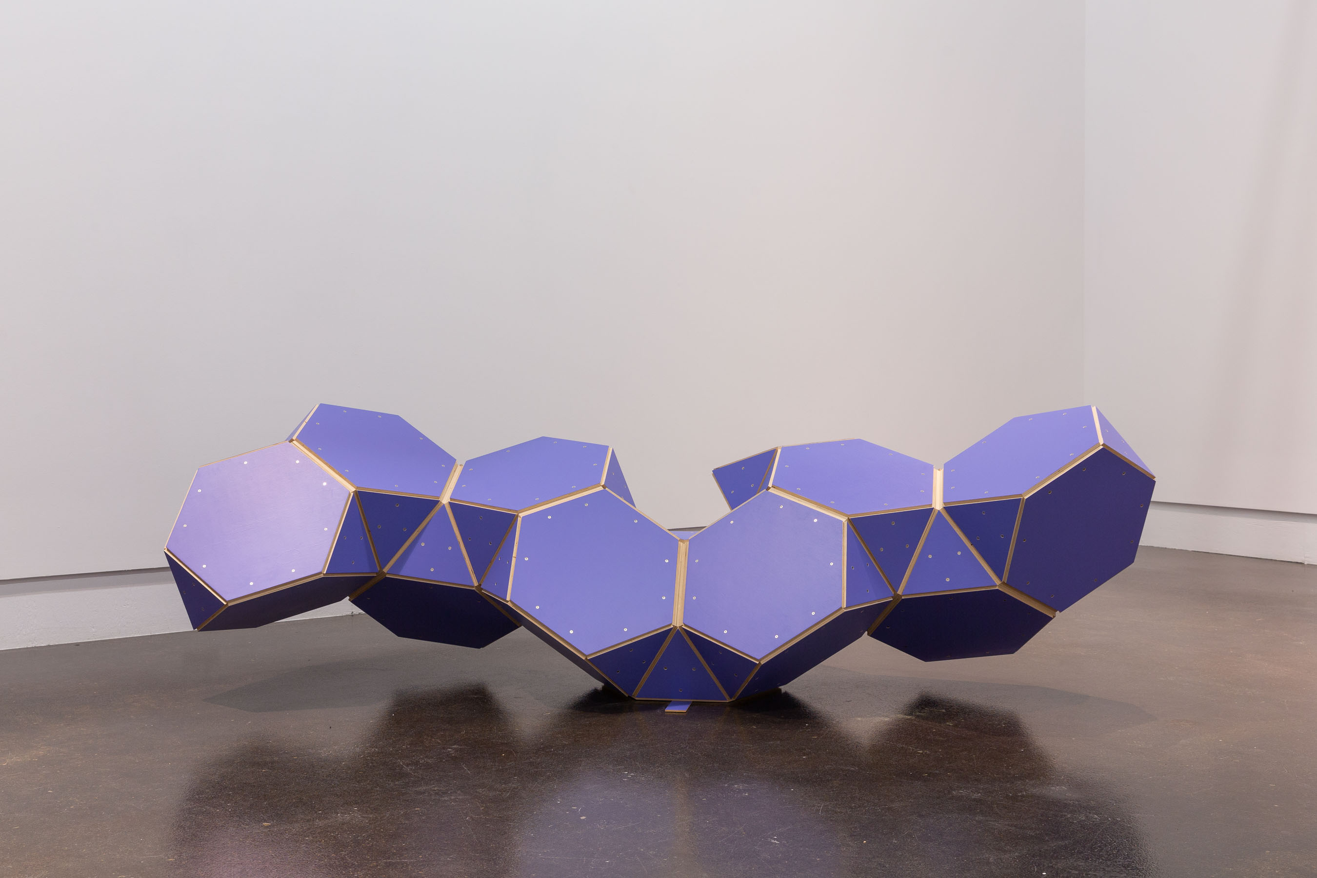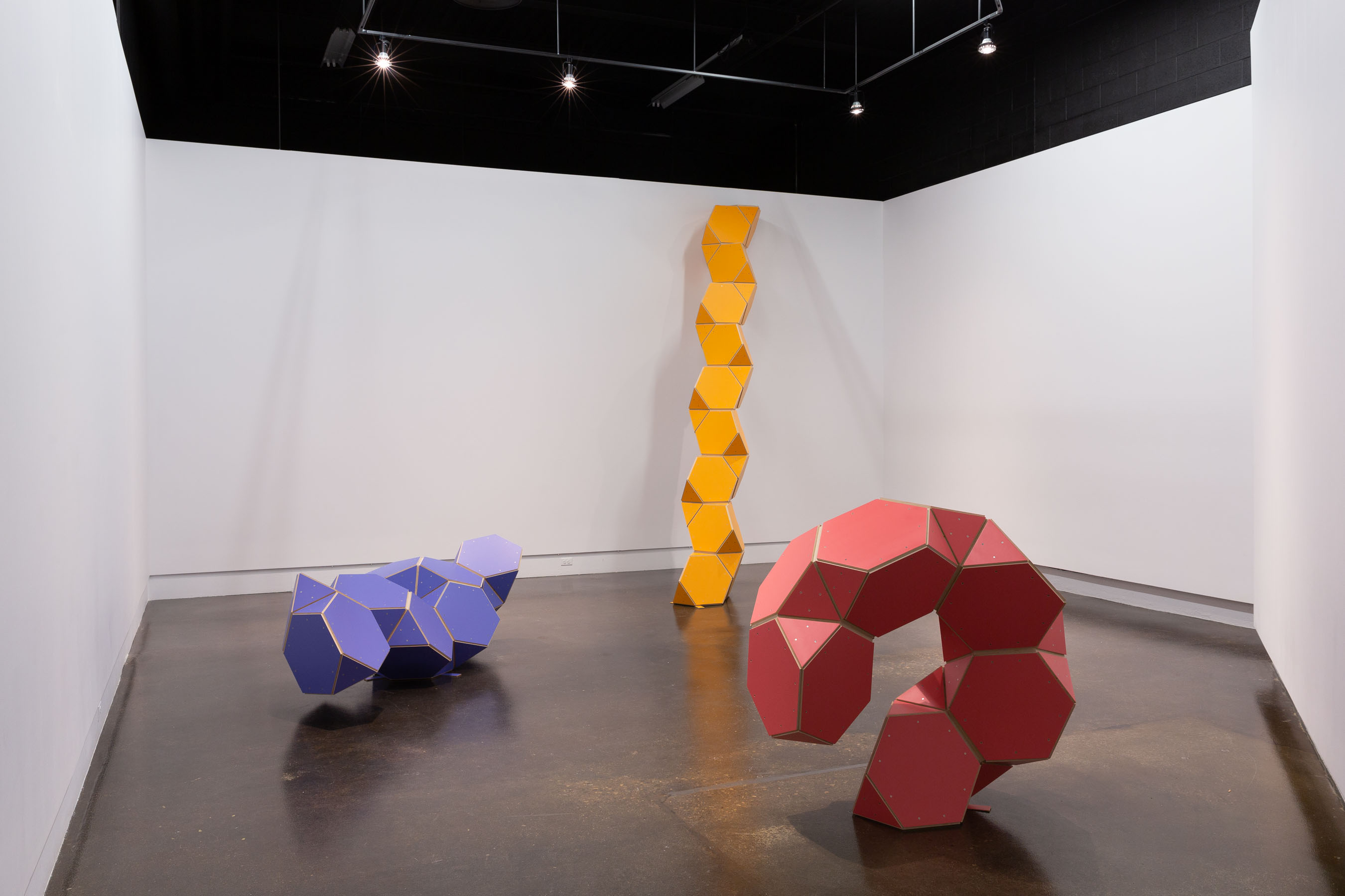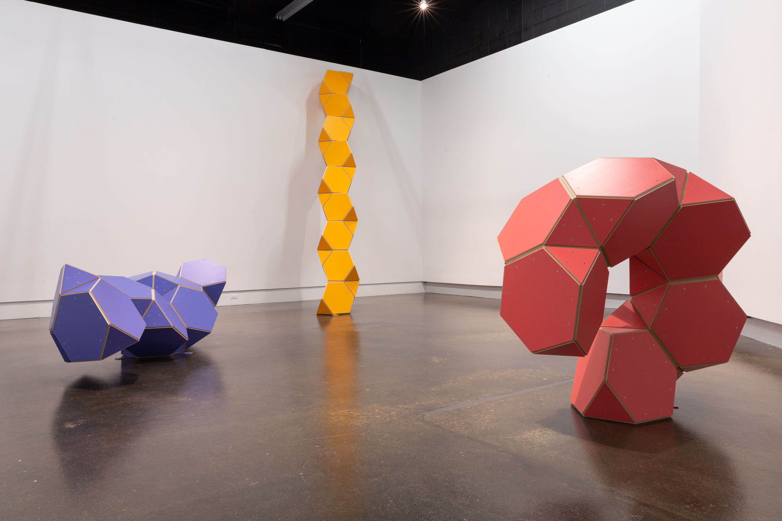 Laura Marotta generates grid systems that disrupt standard square and rectangular structures. Using modular building blocks, she constructs and assembles forms that zigzag back and forth, shaping volumes that are tilting and asymmetrical. New Balance is a series of painted plywood tetrahedron sculptures that twist and turn and loop through space. These objects invite viewers to interact, to walk around and through compositions where negative space is as vital as the positive material form. While they reference public shelters, outdoor seating, or domestic objects like table tops, they also operate as architectural models; speculative plans and imaginative prompts that invite us to consider the potential of interacting—with each other and each form—on macro and miniature scales.