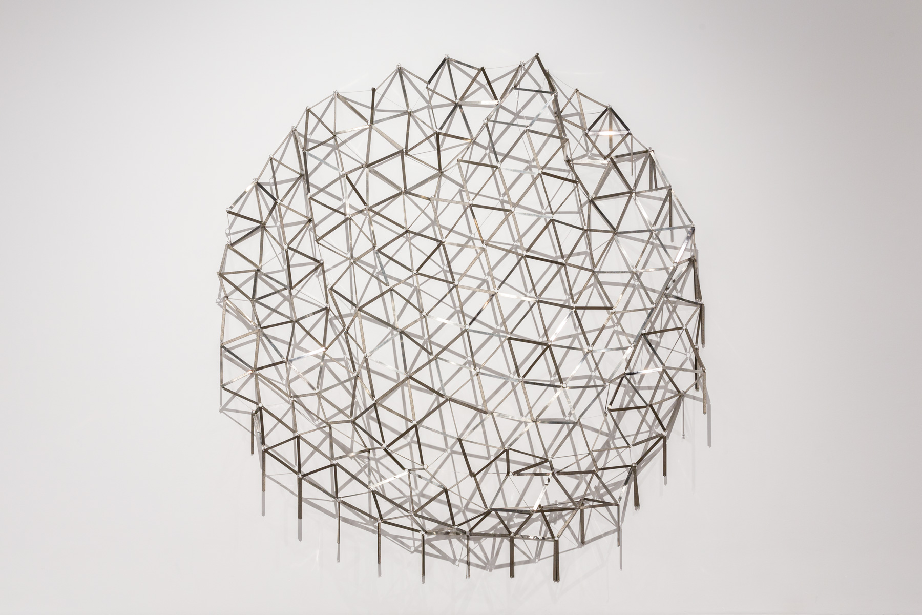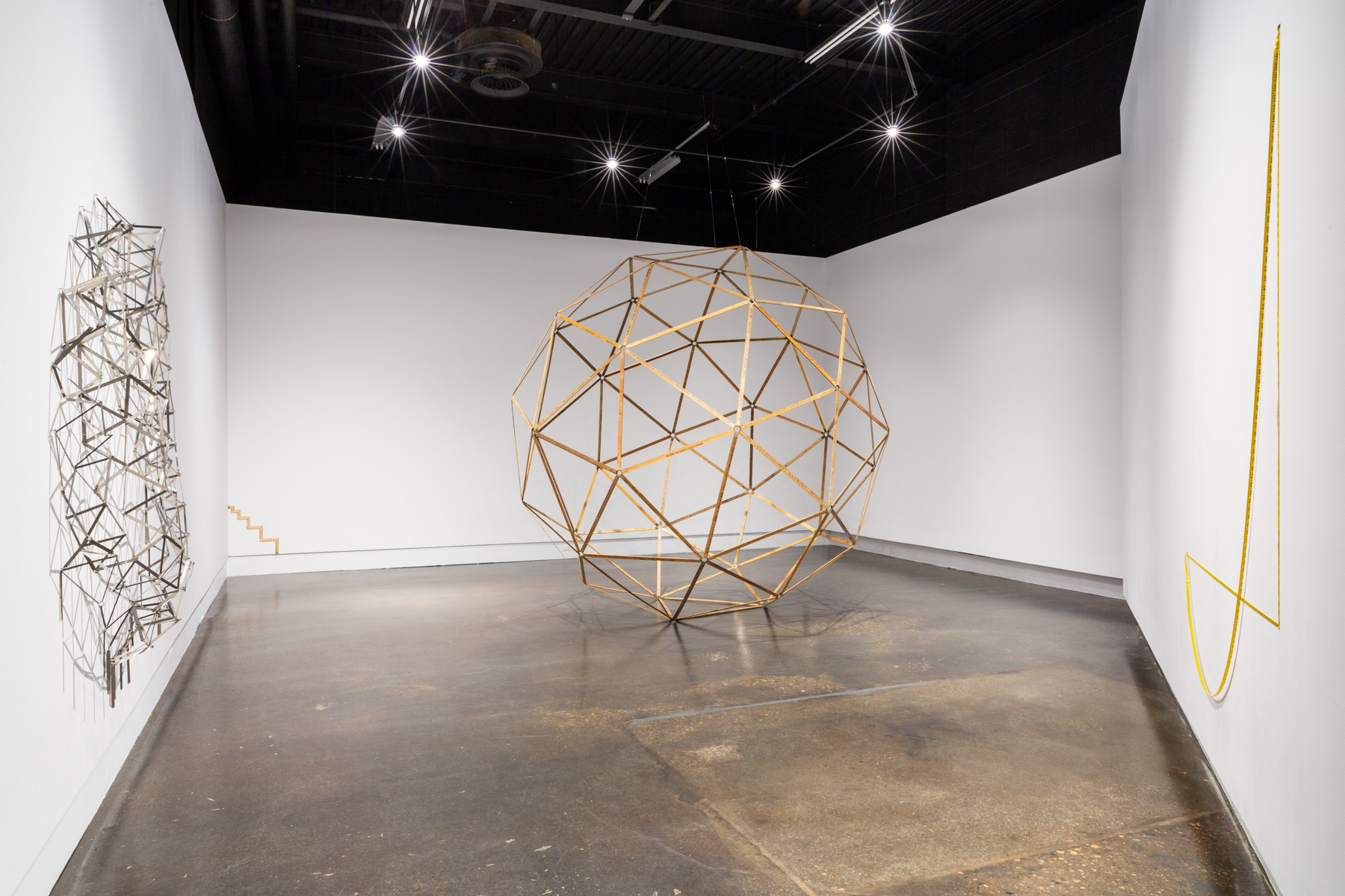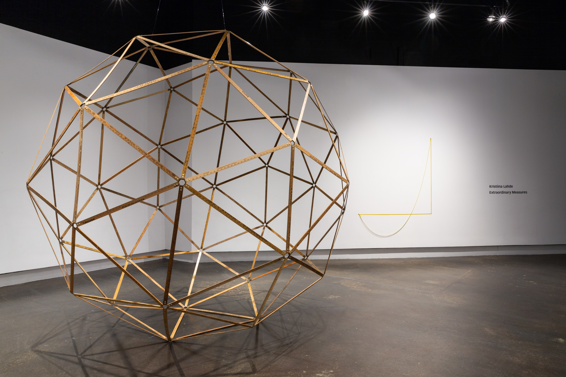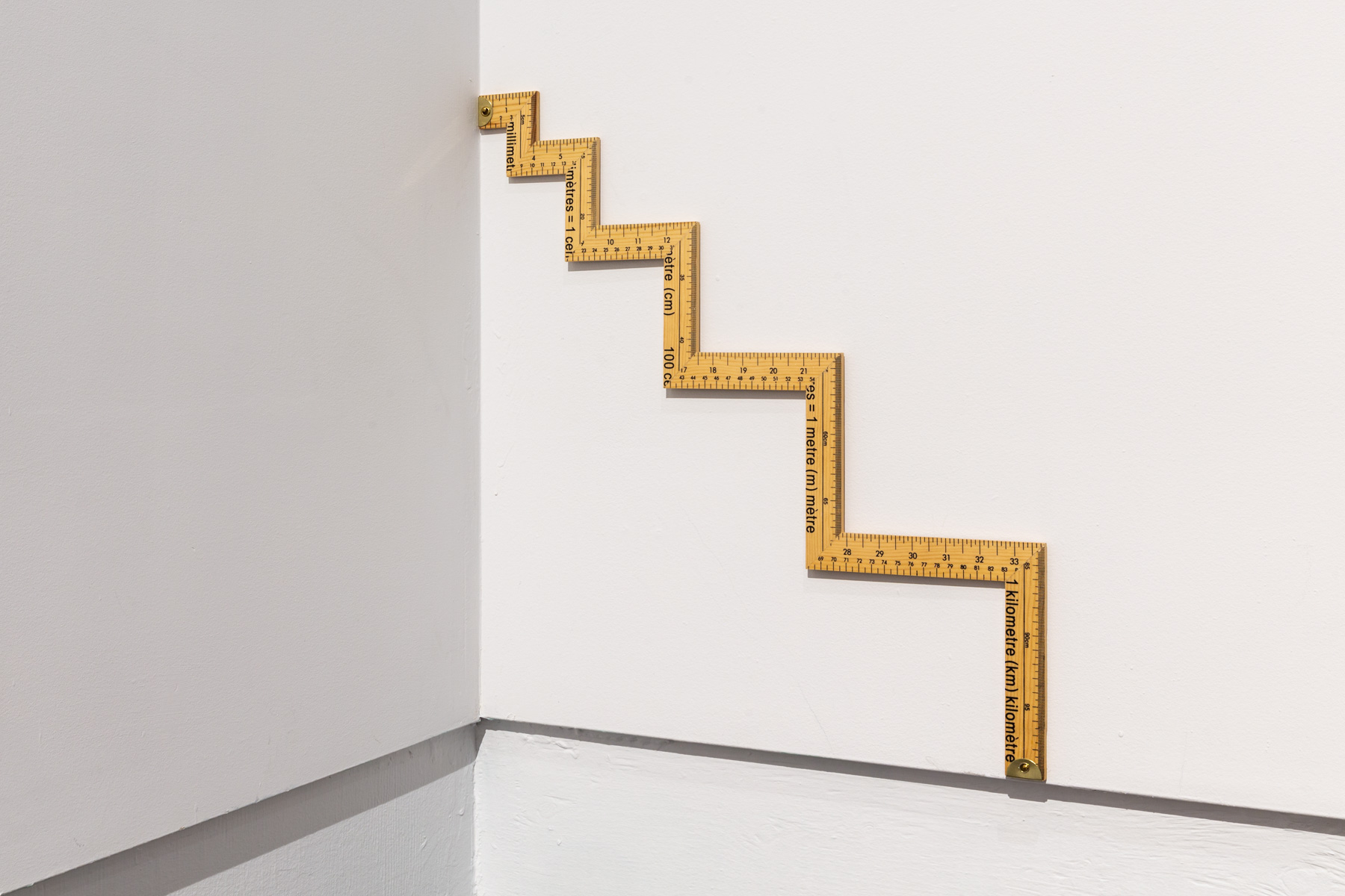 Kristiina Lahde uses elegant conceptual systems to make sculptural constructions, collages, and photographs. In Extraordinary Measures, she turns her attention to tools for measurement by systematically reformatting a series of readymade measuring devices. From a Straight Line to a Curve features a collection of vintage yard sticks that have been bolted together to form a large geodesic sphere. Greater than, Less than uses cloth measuring tapes that have been spliced then nailed to the wall in a series of chevrons: one half held taught while the other surrenders to gravity. A Sequence of Lines and Links conjoins hundreds of steel rulers in a net-like construction that drapes and buckles under its own weight. From point A to point B features a series of wood rulers that have been precisely cut then reassembled in stepped patterns. In reconfiguring these common measuring devices, she removes their function and suspends the ability to demarcate linear units of measure. By breaking these empirical conventions, the artist invites us to imagine data, space, and distance differently.