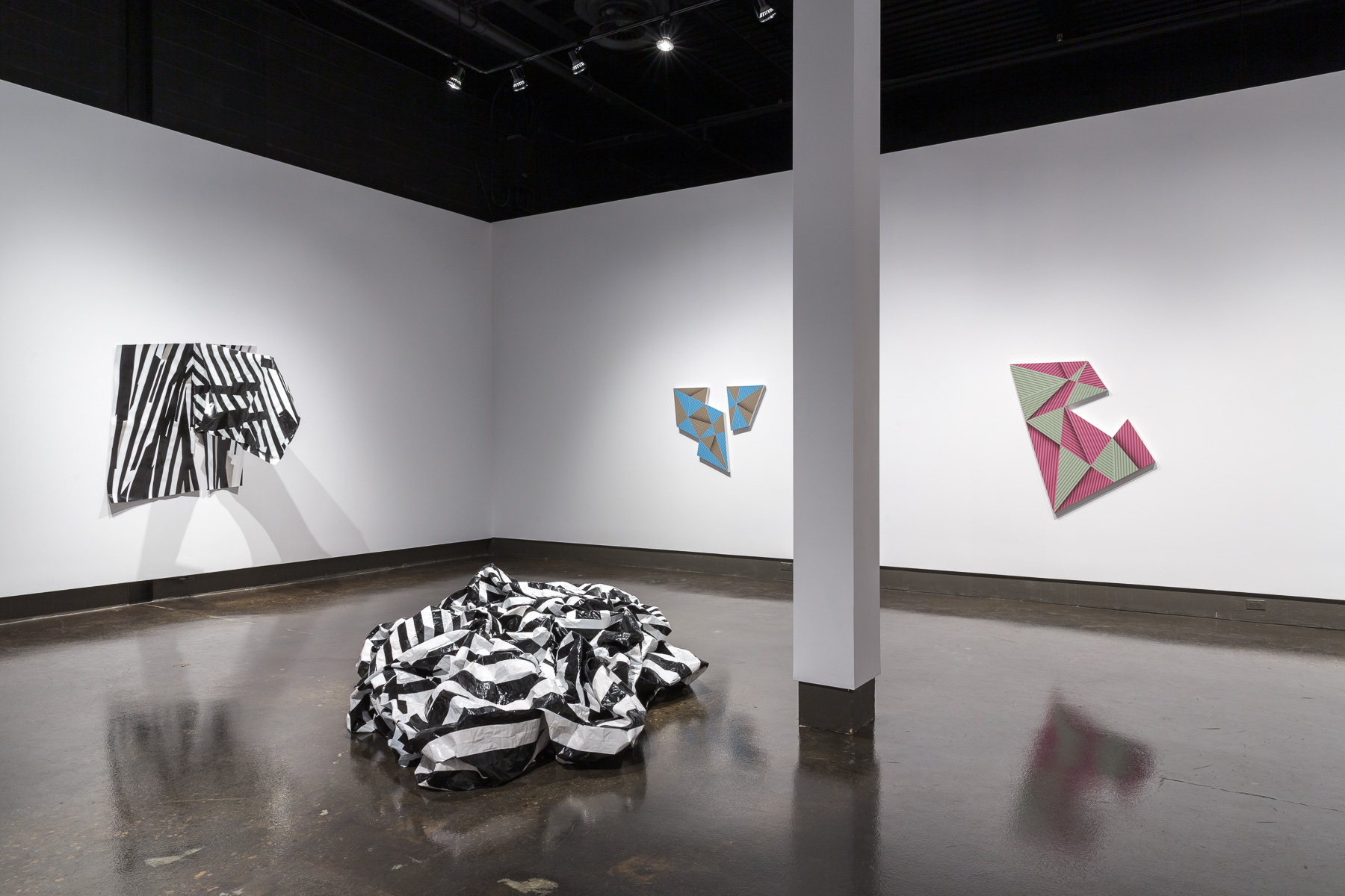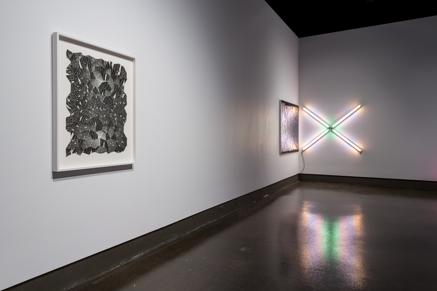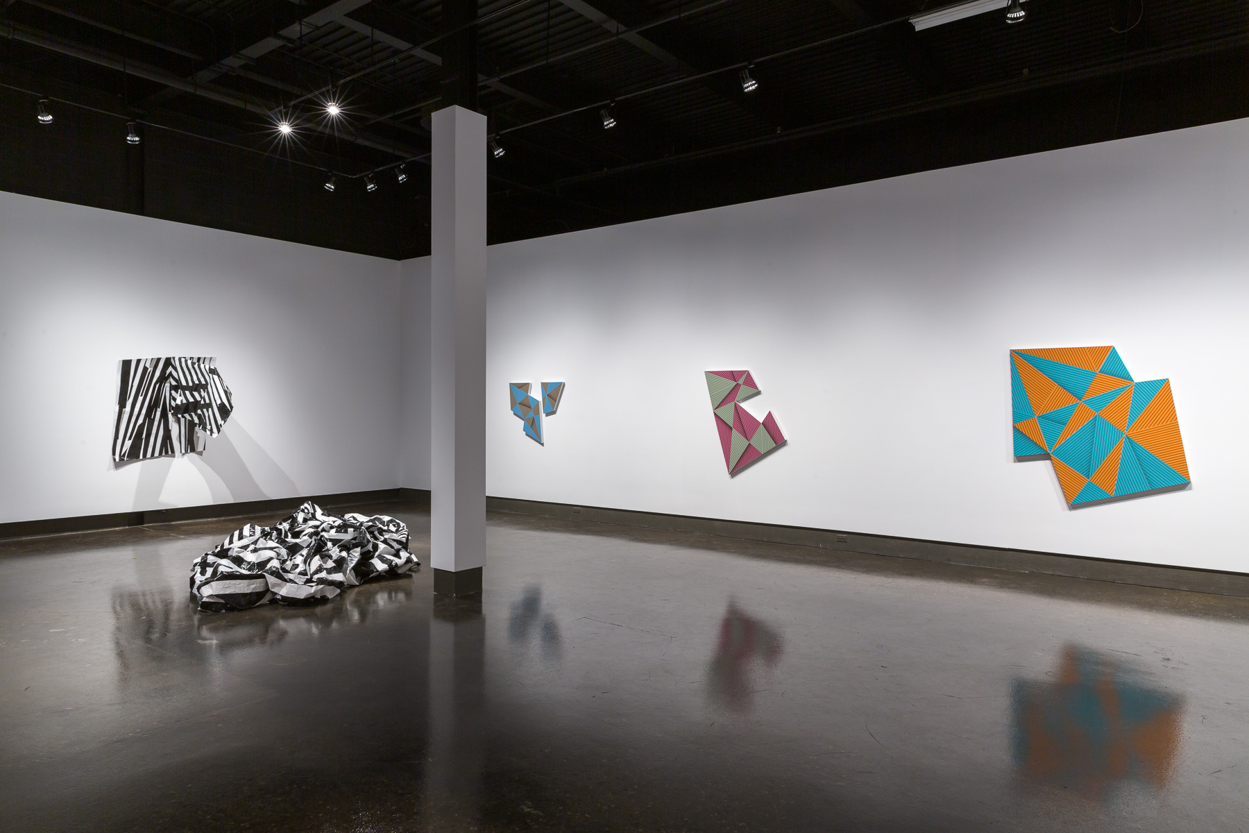 Referencing our biological response to visual stimuli in the form of rapid eye movements (saccades) and the short stops our eyes make in between (fixations), Fixations & Saccades connects the work of six multidisciplinary artists whose process is grounded in abstraction. While exploring some of the same perceptual territory as Op Art, their work is not limited to generating optical effects; rather their purpose is to challenge and disrupt expectations of two- and three-dimensional mediums ranging from painting to print to sculpture. By juxtaposing similarities and differences between materials and processes the exhibition sets out to stimulate an experiential push-pull between divergent approaches to abstraction.