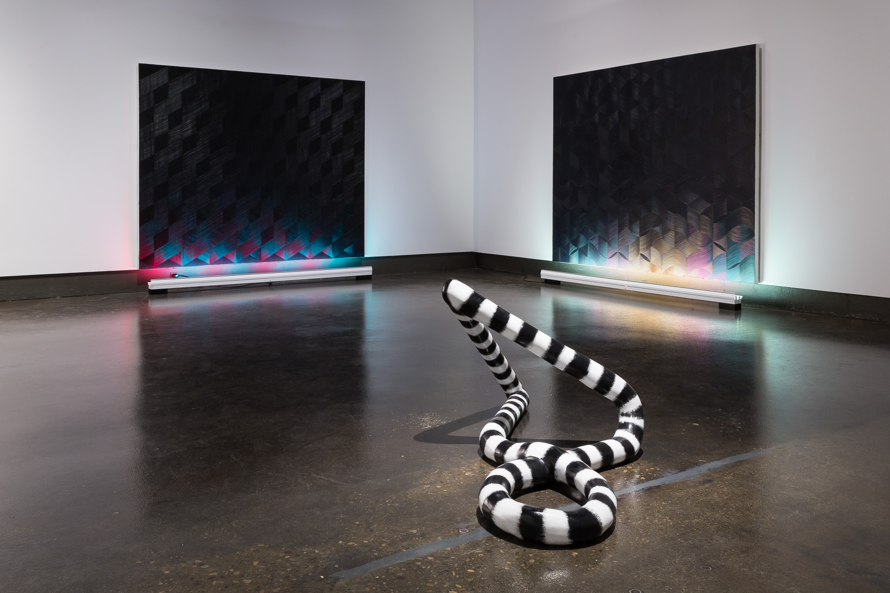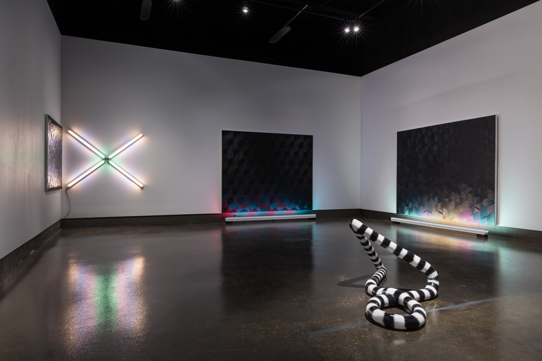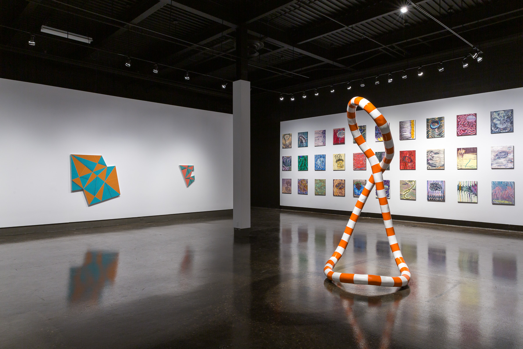 Referencing our biological response to visual stimuli in the form of rapid eye movements (saccades) and the short stops our eyes make in between (fixations), Fixations & Saccades connects the work of six multidisciplinary artists whose process is grounded in abstraction. While exploring some of the same perceptual territory as Op Art, their work is not limited to generating optical effects; rather their purpose is to challenge and disrupt expectations of two- and three-dimensional mediums ranging from painting to print to sculpture. By juxtaposing similarities and differences between materials and processes the exhibition sets out to stimulate an experiential push-pull between divergent approaches to abstraction.