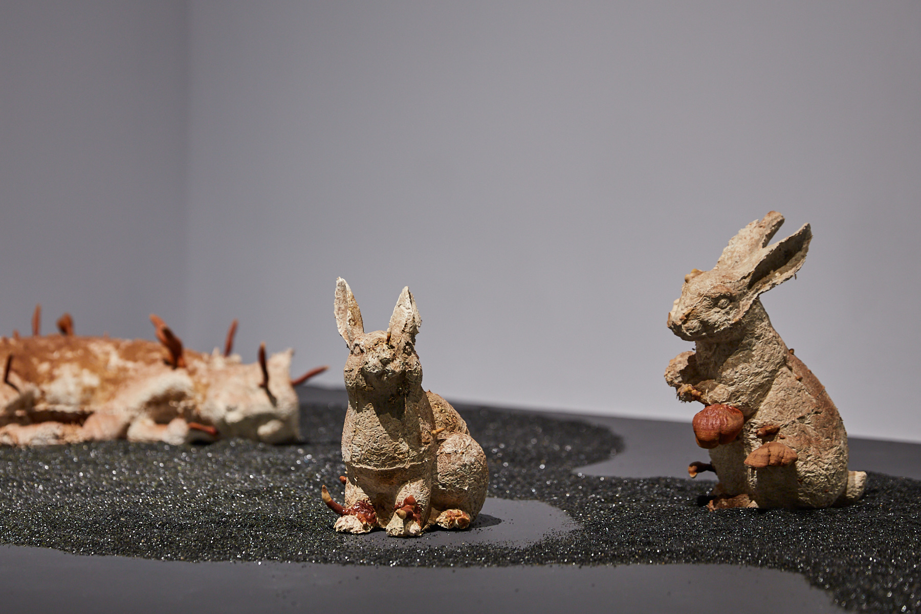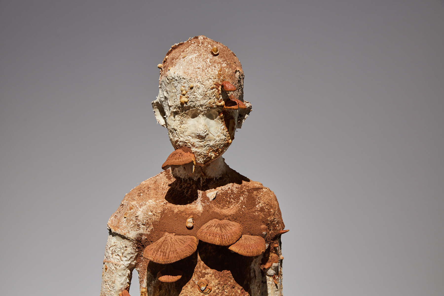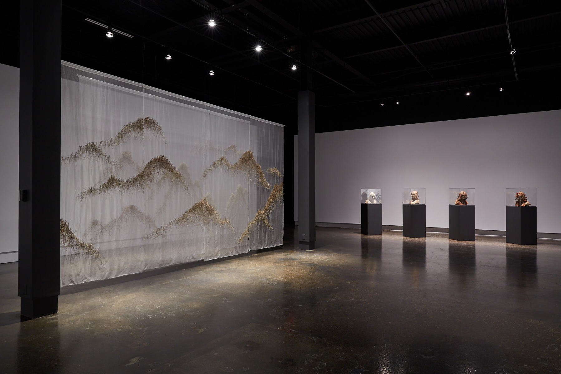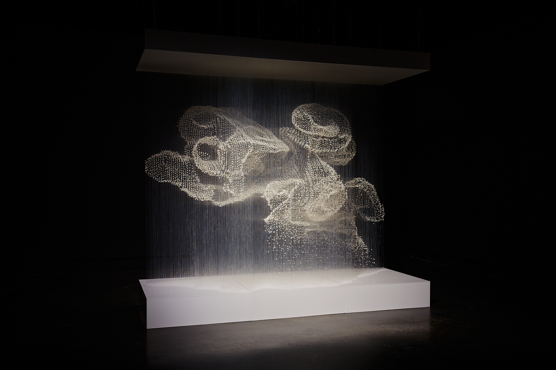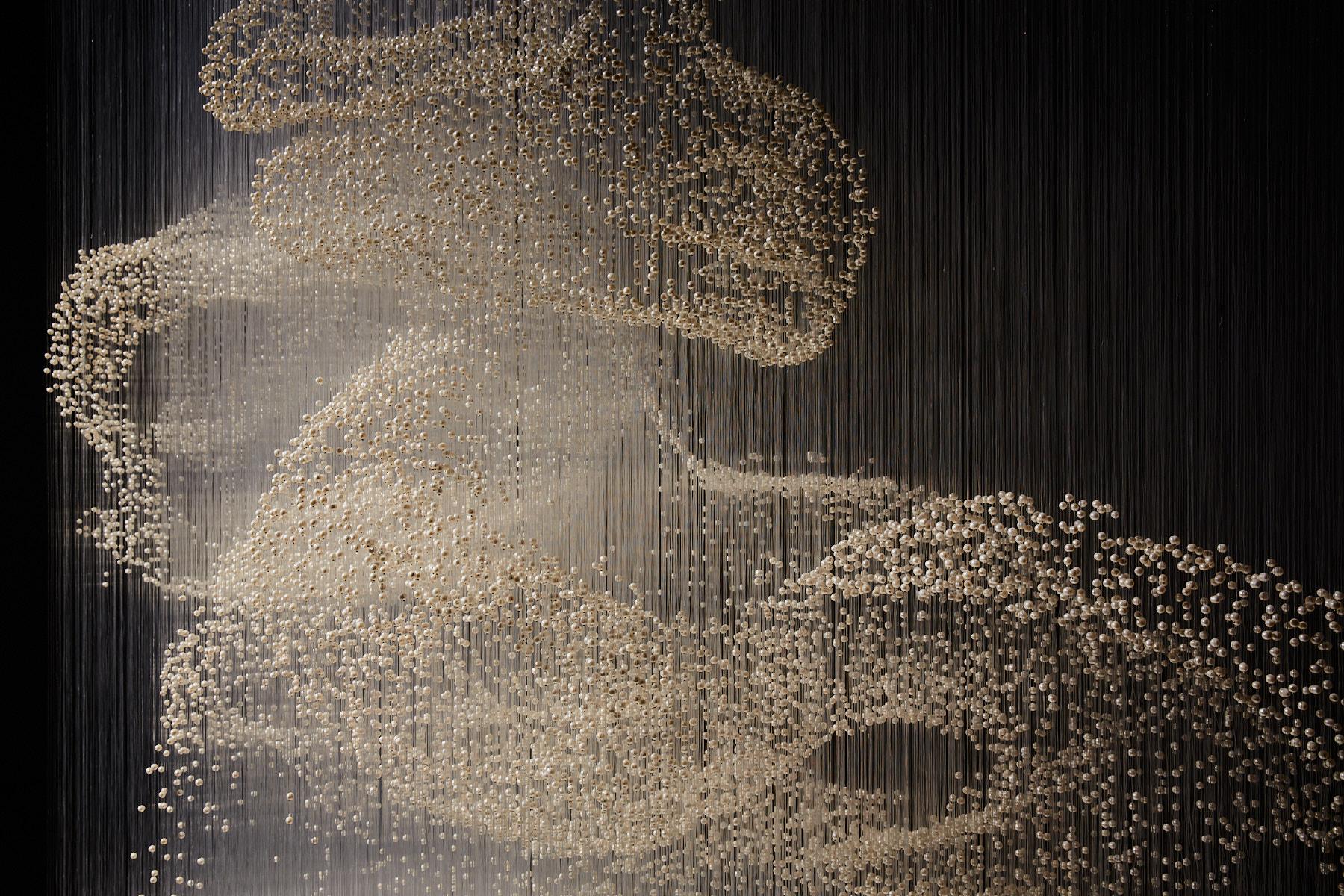 Yan chooses materials based on their symbolic potential: pearls, pine needles, or Lingzhi mushrooms for instance. She activates their latent potential by composing them into complex, often unexpected forms. For Spirit Cloud, the artist uses over 33,000 freshwater pearls to create a luminous oscillating matrix that simultaneously evokes a cumulus cloud or a mushroom. In Mountain of Pines, the hazy, mountainous forms from traditional Chinese landscape painting are achieved by weaving thousands of pine needles through sheets of translucent gauze. For the Lingzhi Girl series, mushroom spores are mixed with wood chips before being set in a mould. The cast is then exposed to humidity and light to spur the mycelium to grow transforming the bust into a one-of-a-kind hybrid portrait that combines nature, science and art.