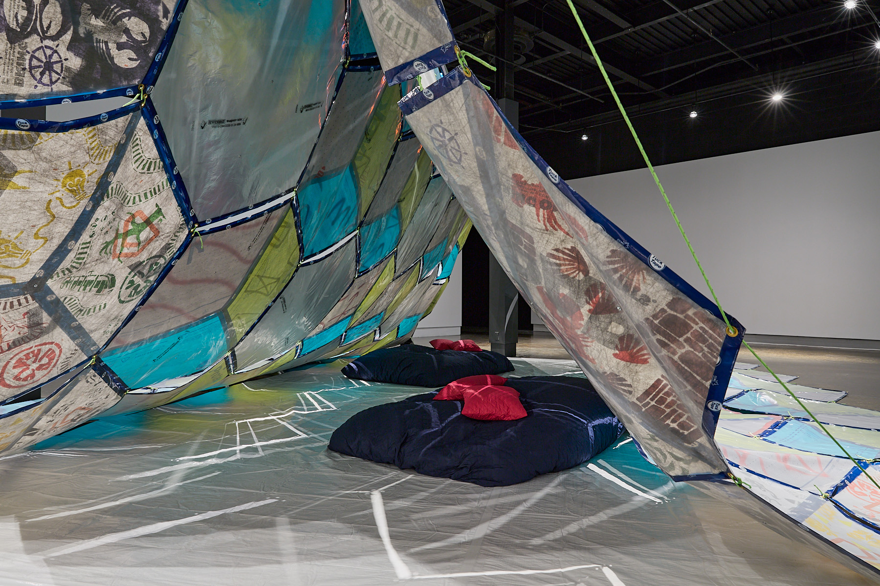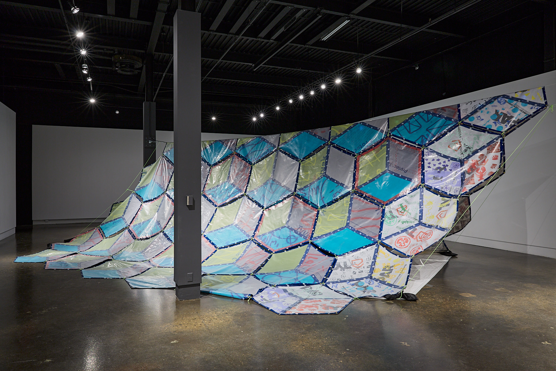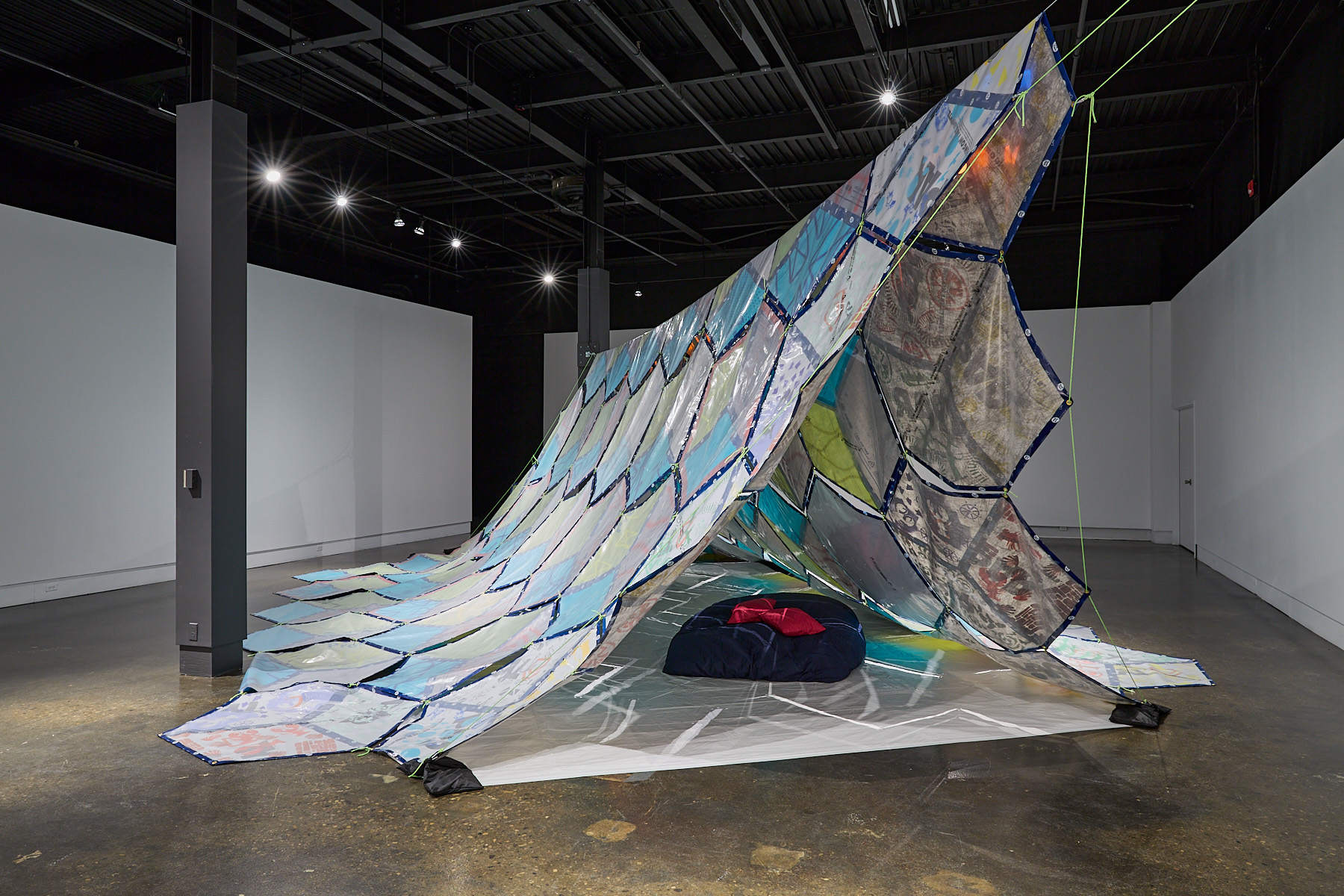 Brenda Mabel Reid’s ongoing large-scale quilt project Underlay explores quilts, architecture and gender-queerness. Reid’s work challenges binary gender norms and uses quilted-architectural forms to explore quilting as a method of making a queer space that brings people together. Composed of 62 hexagonal blocks made of waterproof construction-grade materials, the form uses a classic tumbling block pattern that references both quilting and architecture. Each block is unique, featuring spray-painted patterns related to architectural drawings and materials. The blocks are modular and can be reconfigured via grommeted corners bound together using reflective nylon rope. This iteration of the project suggests an A-frame shelter or a child’s blanket fort. Visitors are invited to remove their shoes, enter the space, and sit or lie down on the futons provided as a place for contemplation or a relaxing nap. In a society predicated on productivity and a 24-hour news and entertainment cycle routinely focusing on crisis and spectacle, Reid proposes the nap as a restorative political action that incites us to revive ourselves and take up space in a joyful manner. As an object that encourages social engagement, Underlay endeavors to provide a safe space for reflection, regeneration, and community-building.