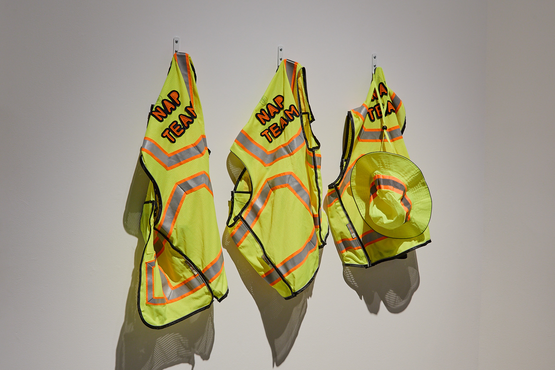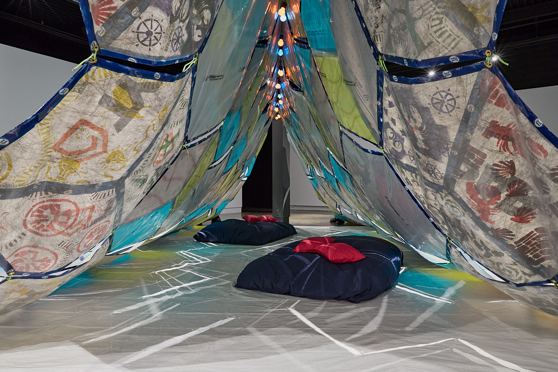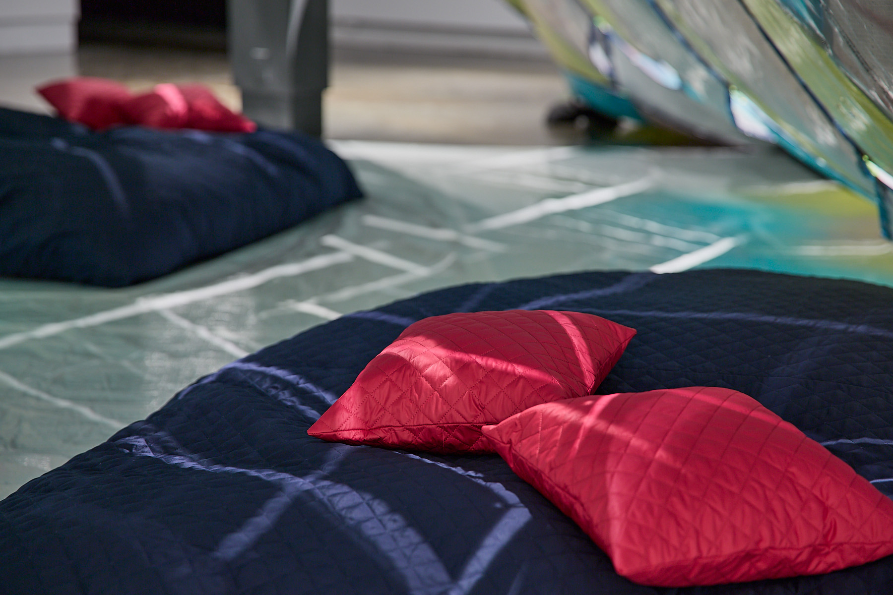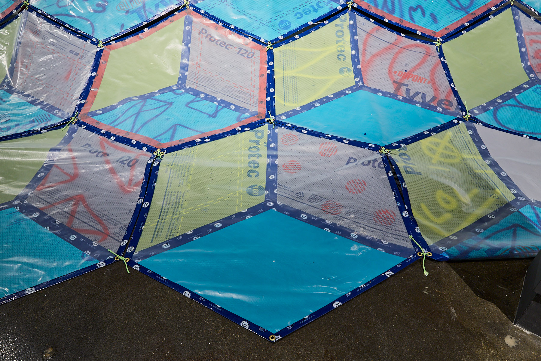 Brenda Mabel Reid’s ongoing large-scale quilt project Underlay explores quilts, architecture and gender-queerness. Reid’s work challenges binary gender norms and uses quilted-architectural forms to explore quilting as a method of making a queer space that brings people together. Composed of 62 hexagonal blocks made of waterproof construction-grade materials, the form uses a classic tumbling block pattern that references both quilting and architecture. Each block is unique, featuring spray-painted patterns related to architectural drawings and materials. The blocks are modular and can be reconfigured via grommeted corners bound together using reflective nylon rope. This iteration of the project suggests an A-frame shelter or a child’s blanket fort. Visitors are invited to remove their shoes, enter the space, and sit or lie down on the futons provided as a place for contemplation or a relaxing nap. In a society predicated on productivity and a 24-hour news and entertainment cycle routinely focusing on crisis and spectacle, Reid proposes the nap as a restorative political action that incites us to revive ourselves and take up space in a joyful manner. As an object that encourages social engagement, Underlay endeavors to provide a safe space for reflection, regeneration, and community-building.